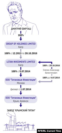 До осени 2016 года завод "Крымский Титан" через цепочку компаний, часть которых находится в Евросоюзе, напрямую принадлежал крупному украинскому бизнесмену Дмитрию Фирташу, а сейчас – его бизнес-окружению. Сам Фирташ не покидает Австрию с 2014 года из-за возможной экстрадиции в США по обвинениям в коррупции. Существовавшая связь Фирташа и предприятия в Крыму подтверждается официальными документами, полученными Настоящим Временем и "Муниципальным сканером" из российского и кипрского бизнес-реестров.