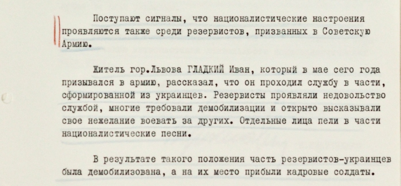 На фоне перемен в Чехословакии чекисты отмечают некоторый рост националистических настроений в Украине. В том числе – среди части резервистов. Львовянина Ивана Гладкого в мае призвали в армию. Он служил в части, большинство в которой составляли украинцы. Резервисты открыто говорили о нежелании “воевать за других” и требовали демобилизации. Некоторые из них еще и пели на территории части "националистические песни" – какие именно, в доносе не уточняется. В итоге часть резервистов-украинцев якобы демобилизовали, прислав вместо них кадровых военных.