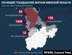 В свою очередь, Офис генпрокурора Украины в ответ на запрос Настоящего Времени подготовил общую статистику по всей Киевской области. С начала полномасштабной войны России против Украины украинские следователи нашли в Киевской области тела 2064 погибших гражданских жителей. Больше всего в Бучанском районе – 1848 тел погибших. Только за преступления на территории Киевской области следователи открыли уголовные производства против 190 российских военных по статье "Нарушение законов и обычаев войны". 73 российских военных украинская сторона считает причастными к умышленным убийствам на территории Киевской области.