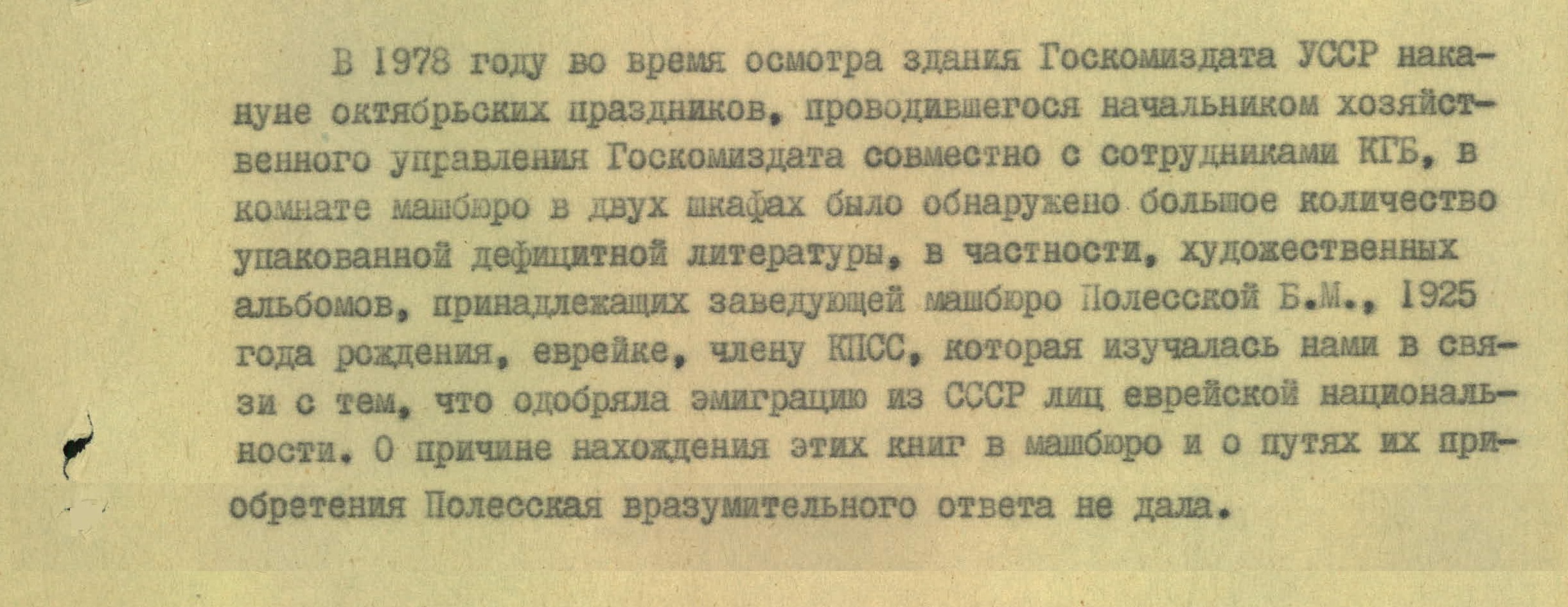 Большое количество такой литературы, в том числе художественных альбомов, нашли сотрудники КГБ во время осмотра здания Госкомиздата УССР в 1978 году. Упаковки с дефицитом лежали в двух шкафах в помещении машинописного бюро. Владельцем оказалась заведующая бюро Б. Полесская. КГБ уже «изучал» ее раньше — женщина одобряла эмиграцию евреев из СССР.