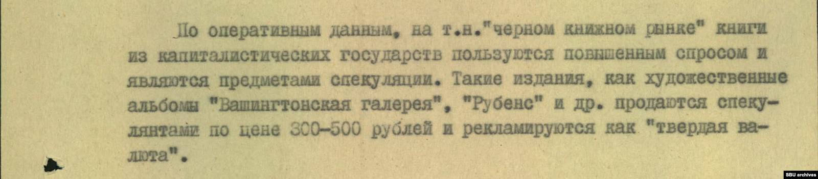 Привезенные с Запада книги пользовались немалым спросом на советском черном рынке. Особенно ценились хорошо иллюстрированные альбомы с картинами — КГБ в качестве примера приводит издания о Рубенсе и Вашингтонской галерее.