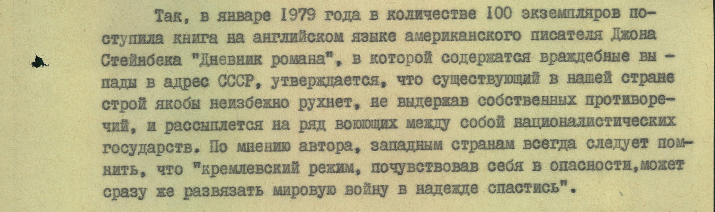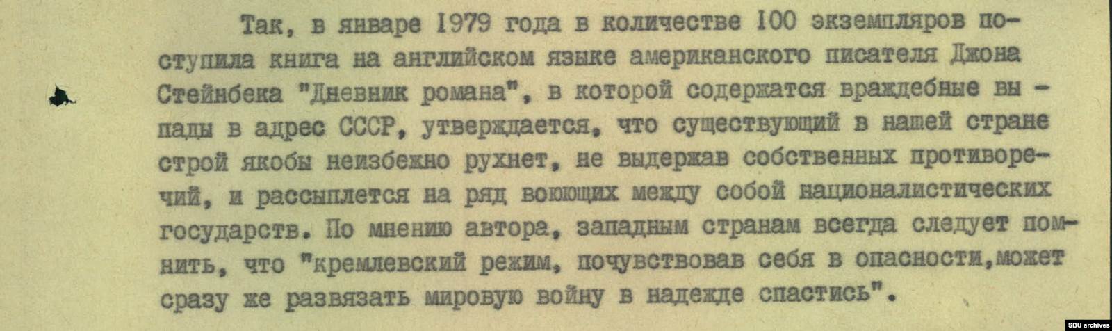 Сто «Дневников...» Стейнбека на языке оригинала привезли в Киев. В тексте нашли «злобные выпады в адрес СССР». Писатель утверждал, что советский строй неизбежно рухнет, не выдержав собственных противоречий, и страна развалится на воюющие между собой националистические государства (так в документе, — НВ). То есть частично предвидел то, что произошло впоследствии.