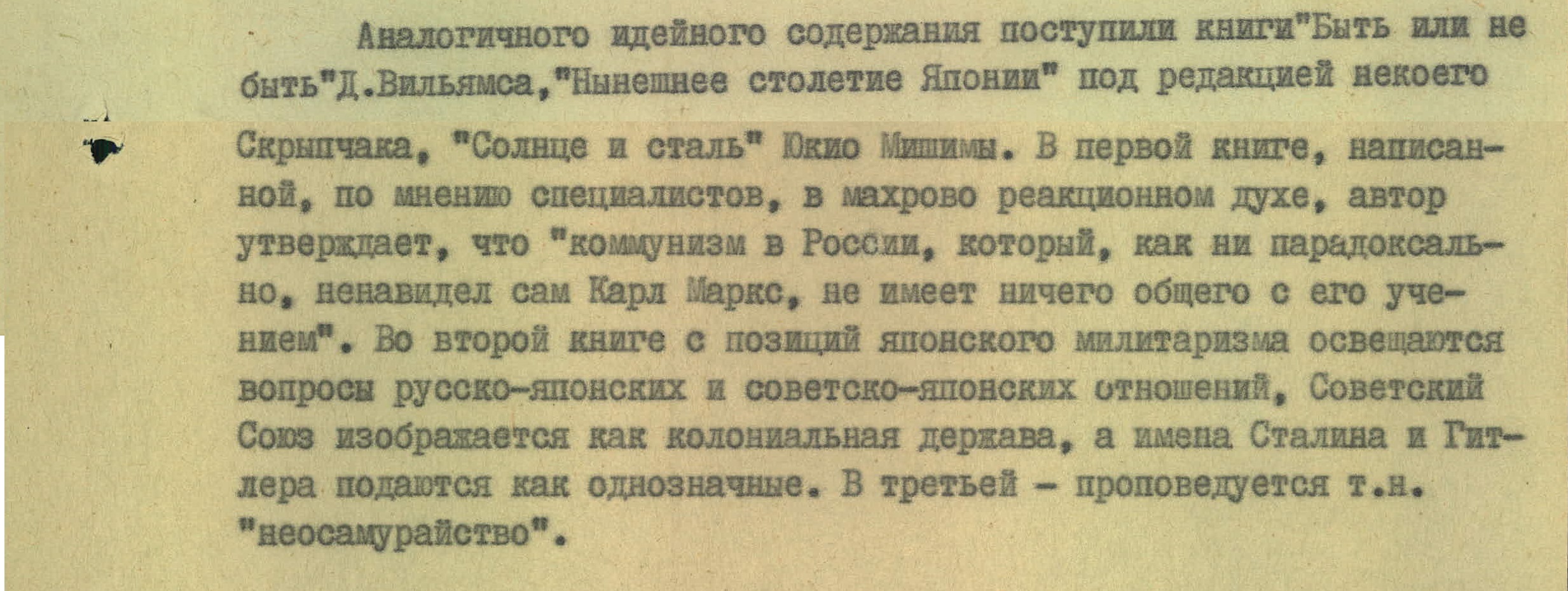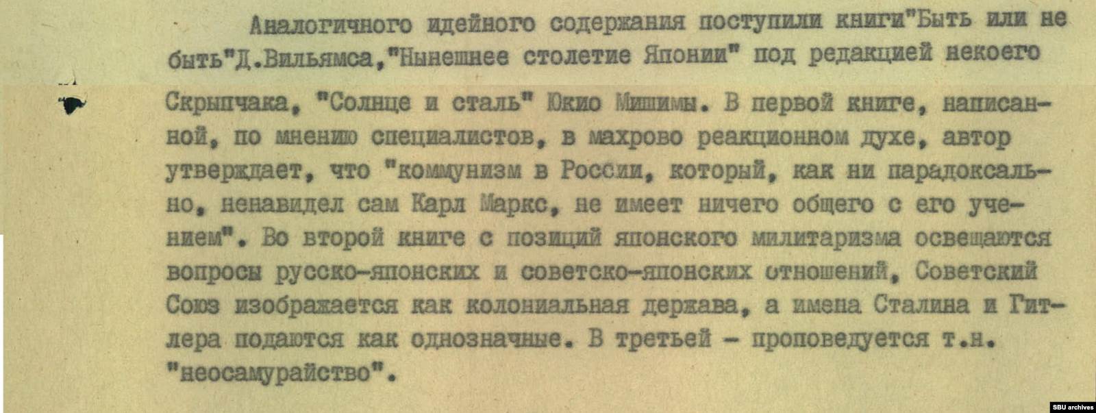 Практическими недоступными для советского читателя были и произведения одного из корифеев японской литературы ХХ века Юкио Мисимы (в документе КГБ использован другой вариант транскрипции — Мишима, — НВ). Ничего удивительного — в середине 60-х писатель примкнул к ультраправым, что отразилось на его творчестве.