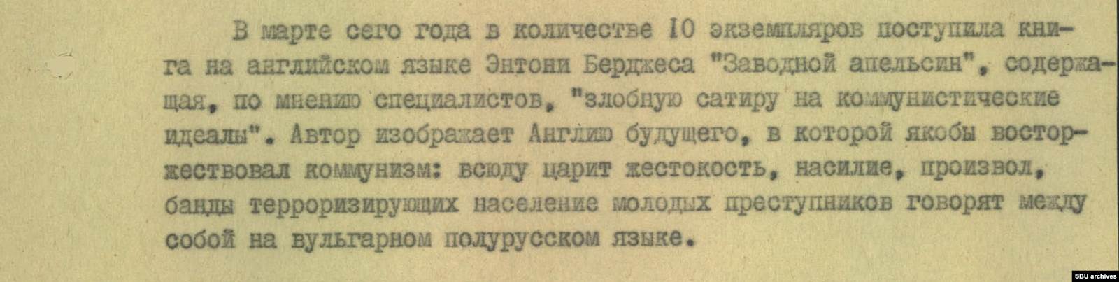 Так КГБ в своем сообщении характеризует роман Энтони Берджеса «Заводной апельсин». В Киев в 1979-м завезли десять экземпляров книги на английском.
