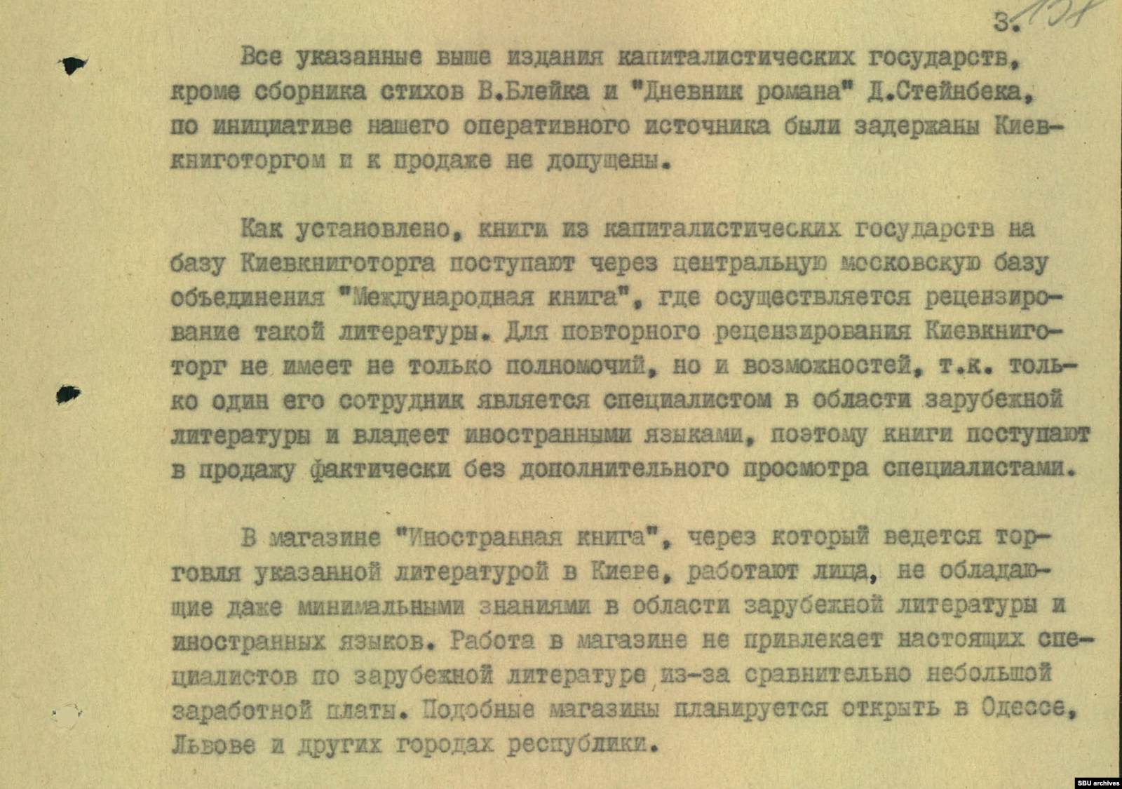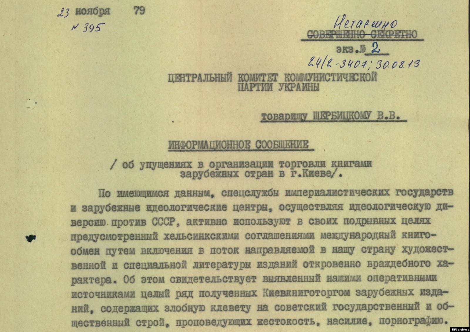 Конечно, книги попали в магазин не просто так — это была идеологическая диверсия, спланированная «спецслужбами империалистических государств и зарубежных идеологических центров», писал председатель КГБ Украинской ССР Виталий Федорчук в ноябре 1979 года главе республики Владимиру Щербицкому. Составленный им документ называется «Об упущениях в организации торговли книгами зарубежных стран в г. Киеве».
