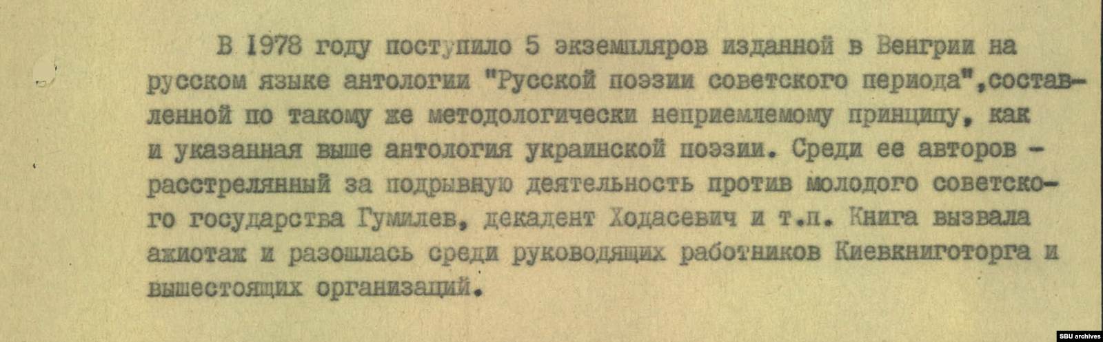 «По такому же методологически неприемлемому принципу» была составлена, по мнению источника спецслужбы, и антология русской поэзии советского периода, изданная в Венгрии на русском языке. Среди авторов в сообщении выделены «расстрелянный за подрывную деятельность против молодого советского государства Гумилев, декадент Ходасевич и т.п.».