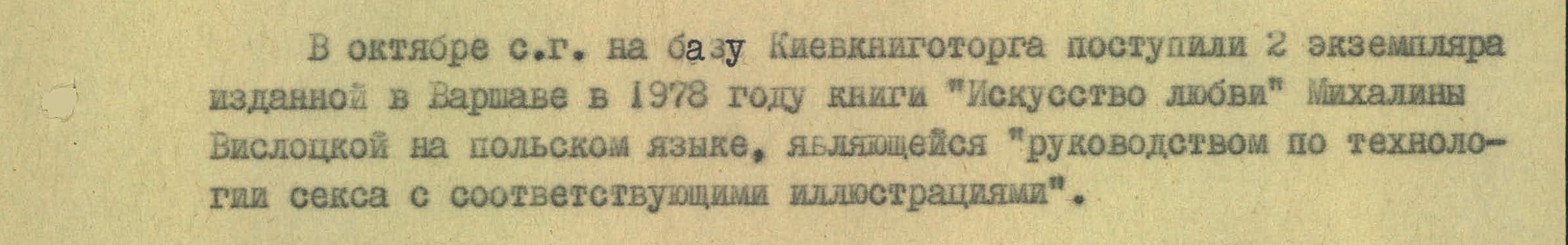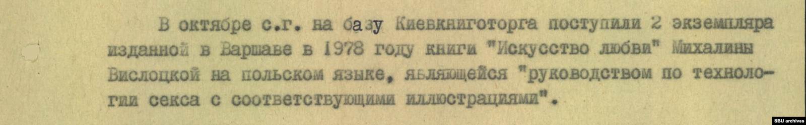 Но компромисс — это не про советские контролирующие органы. Два экземпляра польского издания, поступившие на киевскую базу, удостоились отдельного абзаца в документе. «Руководство по технологии секса с соответствующими иллюстрациями», — так характеризуют книгу чекисты.