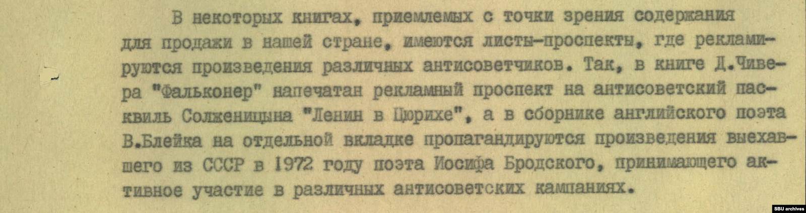 В поле зрения КГБ попадали даже книги «правильного» содержания, в которых издательства размещали рекламу «произведений различных антисоветчиков». В романе Джона Чивера нашли рекламный проспект «Ленина в Цюрихе» Александра Солженицына. А в сборнике стихов Уильяма Блейка «на отдельной вкладке пропагандировались произведения выехавшего из СССР в 1972 году поэта Иосифа Бродского, принимающего активное участие в различных антисоветских кампаниях».