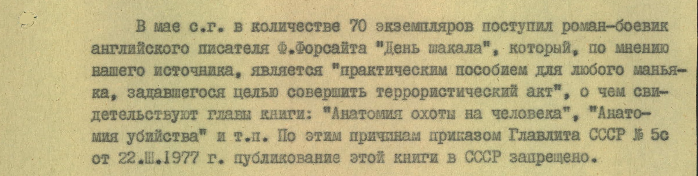 «Практическим пособием для любого маньяка, задавшегося целью совершить террористический акт», спецслужба назвала — со ссылкой на свой источник — роман «День Шакала».
