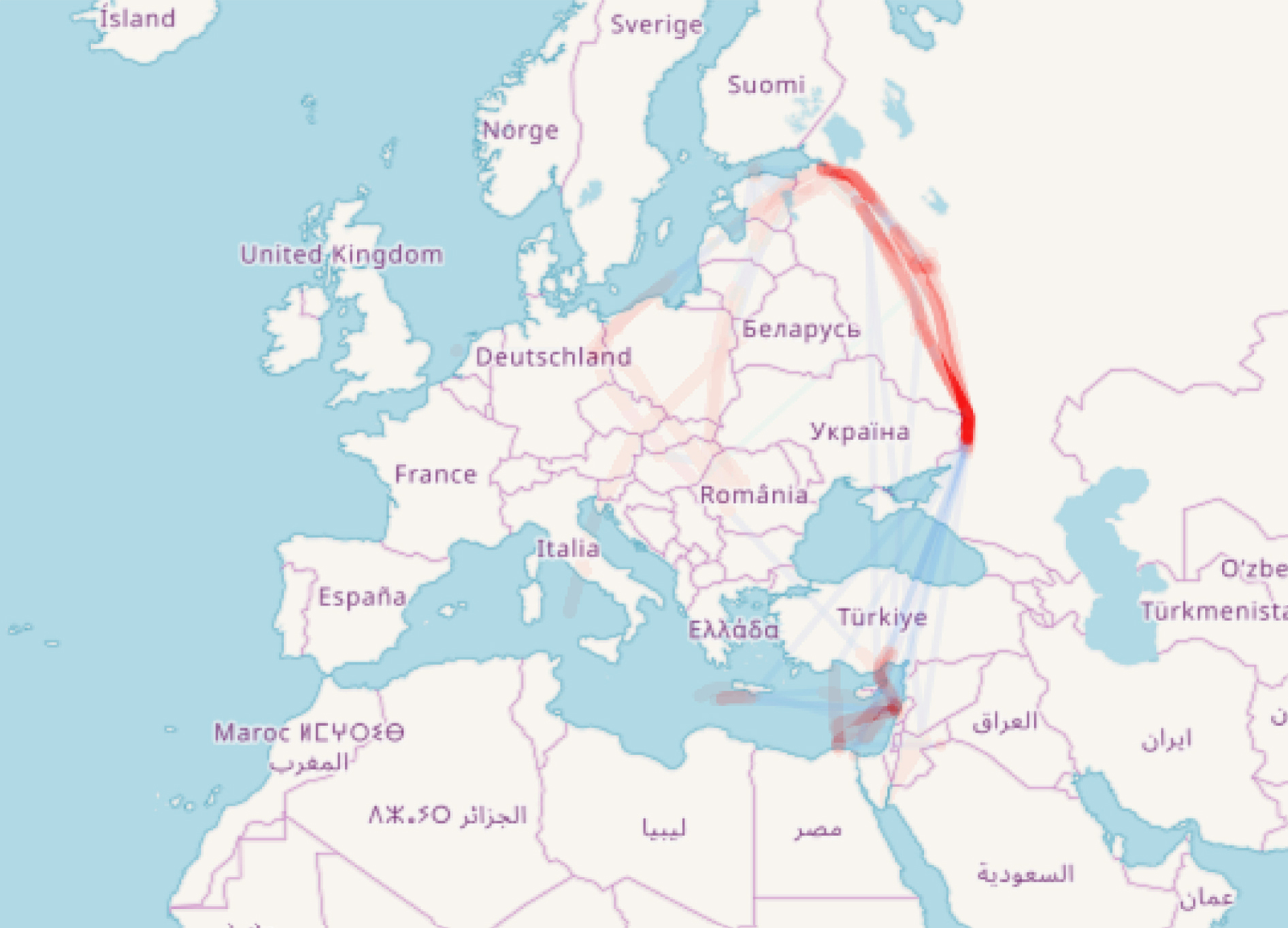 Сравнительная карта авиаперелетов: на первом слайде совмещены 80 треков борта M-VITO, на втором — 40 треков самолета VP-CSP. Каждый трек может включать полет в одну сторону, рейс туда и обратно или даже сложный маршрут с несколькими промежуточными посадками. Как видно, M-VITO чаще использовался для путешествий в Германию, оба самолета множество раз засекались приемниками в районе островов Кипр и Крит, направляясь к побережью Ливана, Ливии и Сирии. Карта: OpenStreetMap