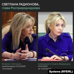 Кроме того, на "консервы" указывает и расположение ручек и карандашей. Например, на второй встрече Путина со Светланой Чупшевой в сентябре 2025 года письменные принадлежности на столе у президента стоят точно так же, как и на встрече с Радионовой в октябре. Между двумя этими встречами прошло почти полтора месяца и девять других мероприятий в кремлевском кабинете. И каждый раз ручки и карандаши стояли по-разному, кроме этих двух встреч.