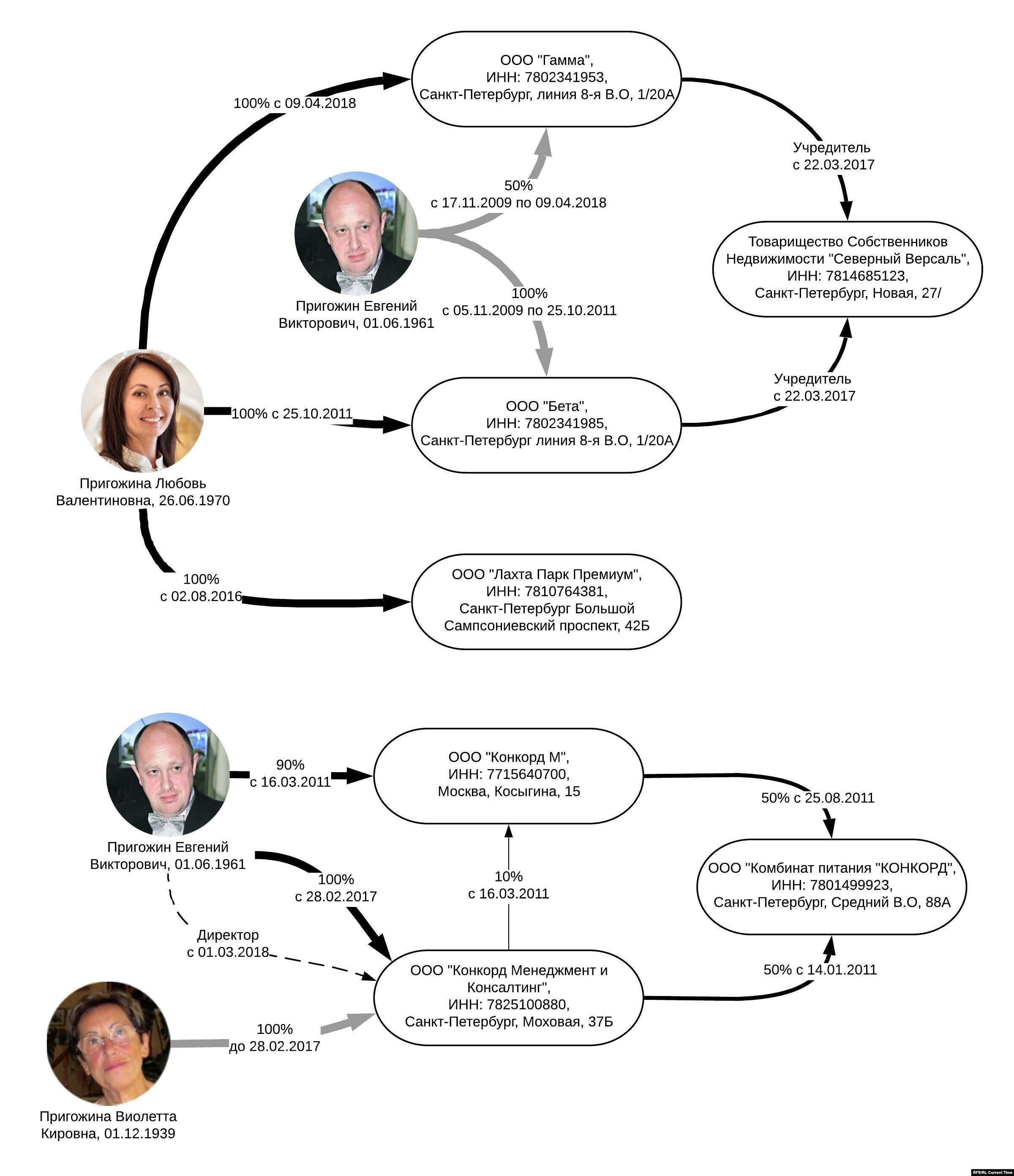 До 2011 года Евгений Пригожин был владельцем и совладельцем компаний «Бета» и «Гамма», позже они принадлежали его супруге Любови. В 2017 году «Бета» и «Гамма» учредили ТСЖ «Северный Версаль», а в 2016 году Любовь Пригожина стала владеть компанией «Лахта Парк Премиум». Владельцем головной компании Пригожина «Конкорд менеджмент и консалтинг» до февраля 2017 года выступала его мать — Виолетта Пригожина, после Евгений Пригожин стал владеть фирмой лично.