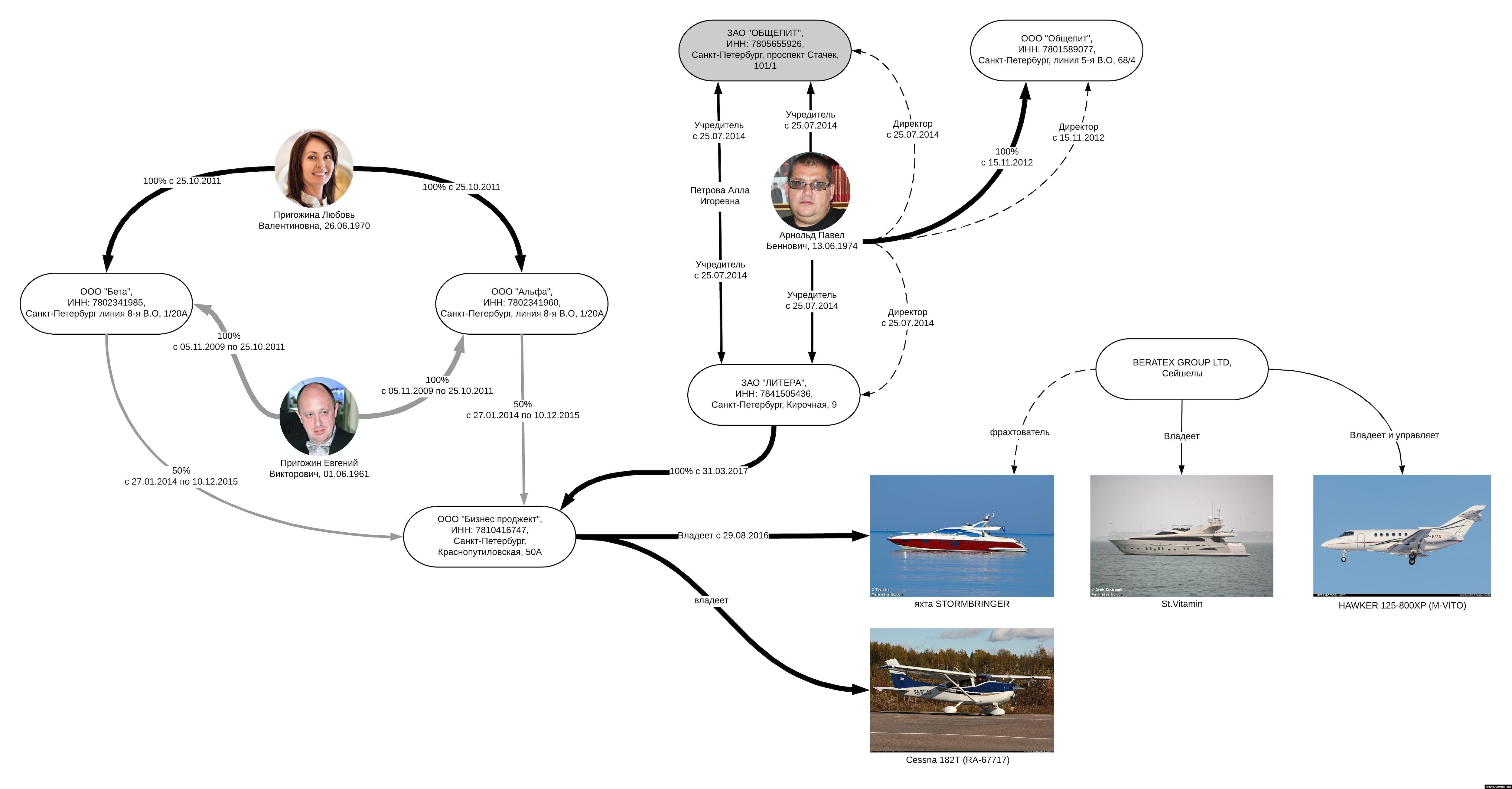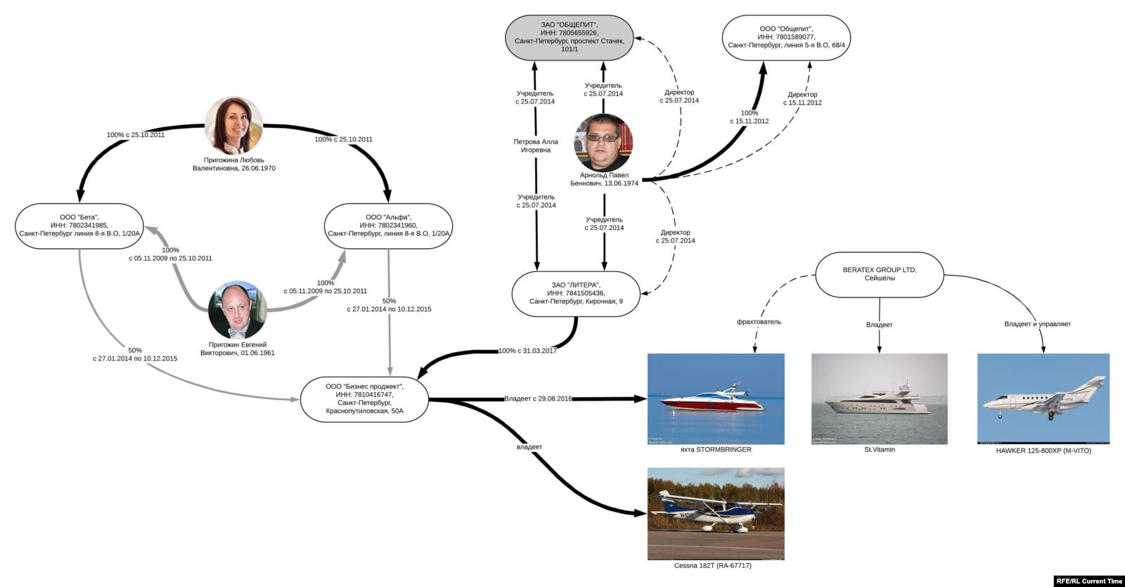 Евгения Пригожина и Павла Арнольда связывают не только бизнес на готовом питании и общий вертолет. Арнольд в 2014 году выступил учредителем компании ЗАО «Литера», которая с марта 2017 года стала владеть компанией ООО «Бизнес проджект». До этого «Бизнес проджект» принадлежала семье Пригожиных напрямую.