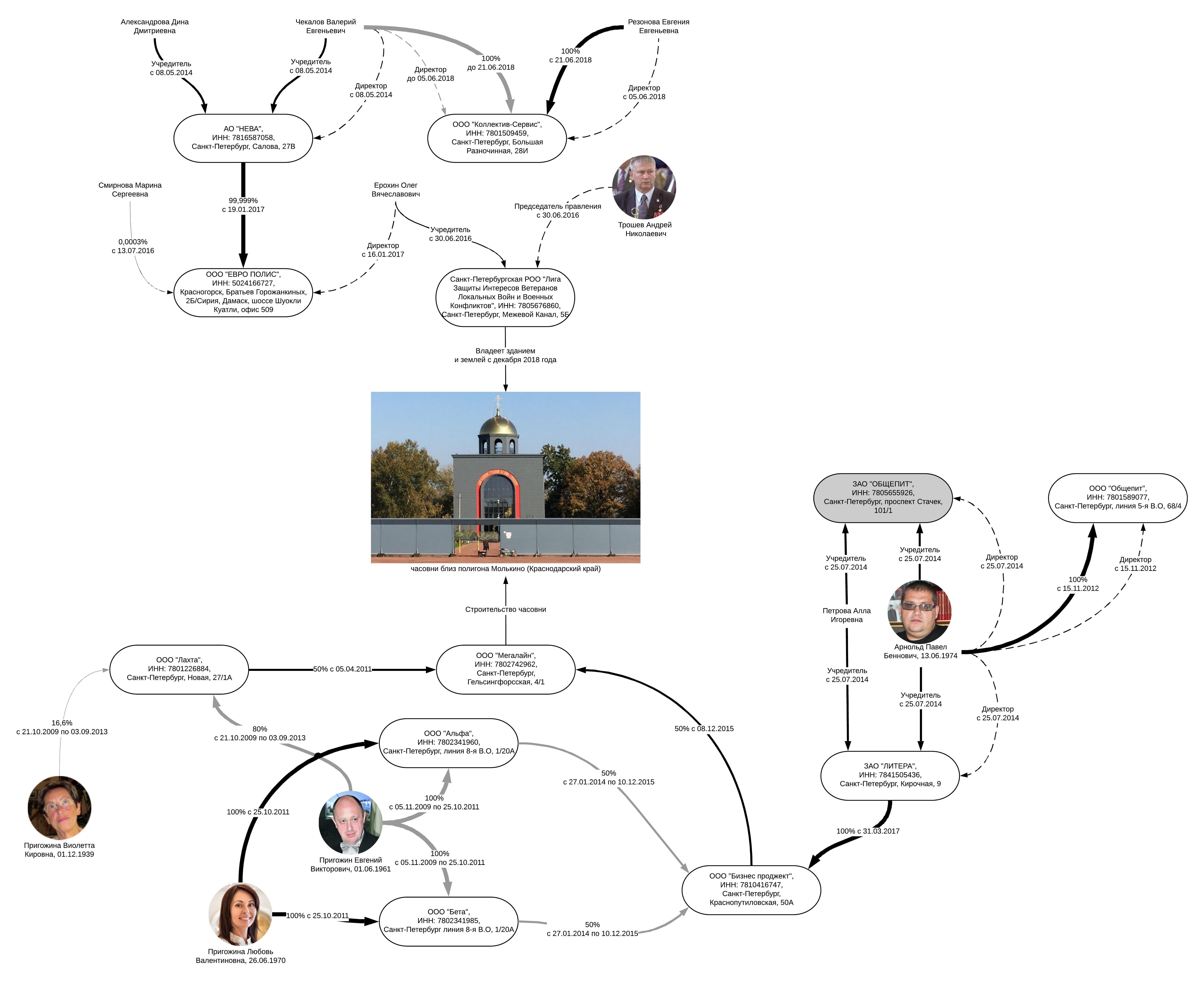 Примеры цепочек связей между компаниями Пригожина оказываются очень важными для понимания структуры бизнеса, который невозможно ухватить никакими точечными проверками и расследованиями. Слишком большую картину сложно удержать в голове — да и кому будет интересно разбираться в десятках ООО, которые получают госконтракты.